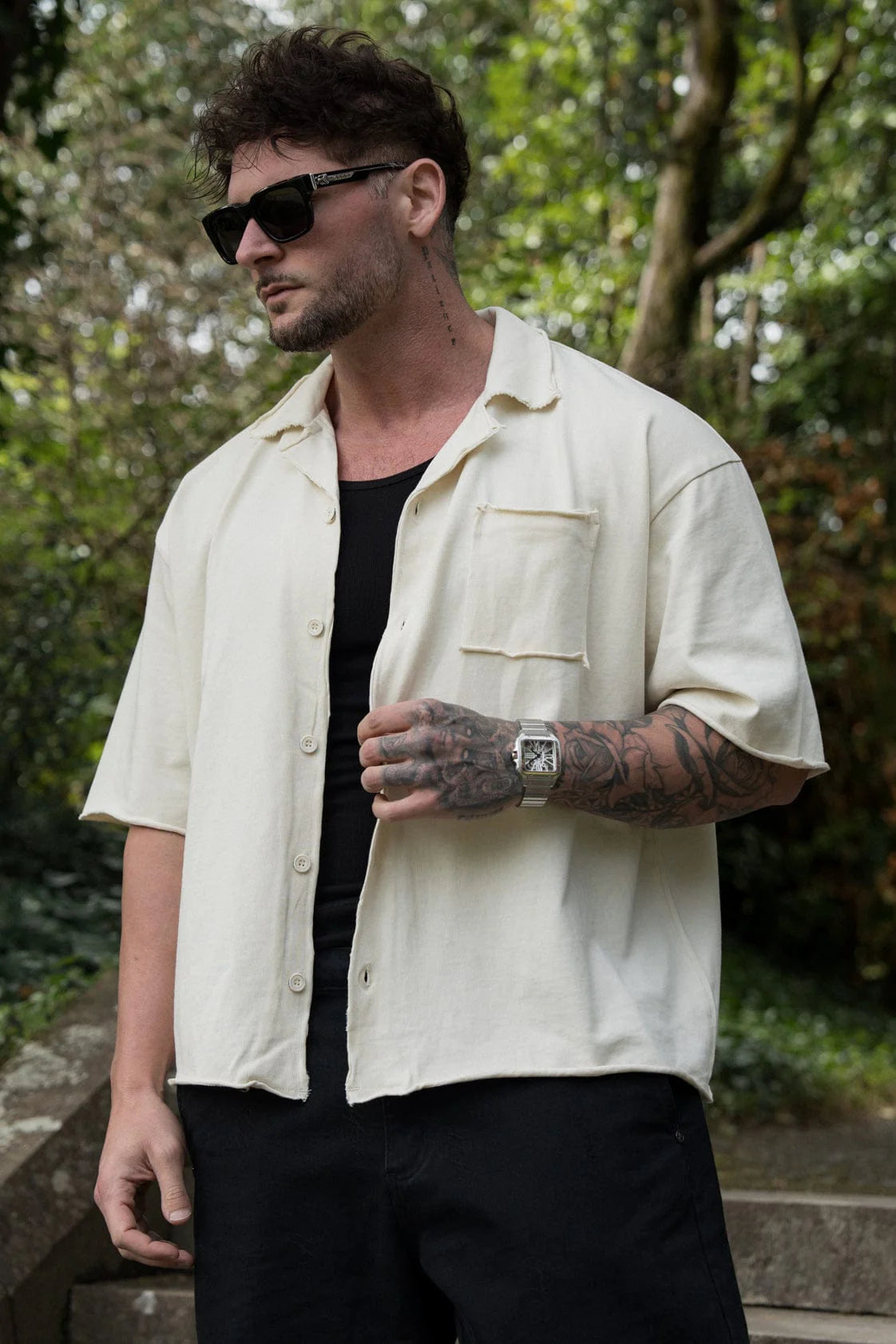 DESIGN: Designed with attitude. This 100% cotton button-up features a loose, boxy fit with a slightly cropped length—finished off with raw cut hems, sleeves, and edges for that perfect worn-in edge. It’s clean, minimal, and hits hard with just enough street energy to elevate your fit without overdoing it.